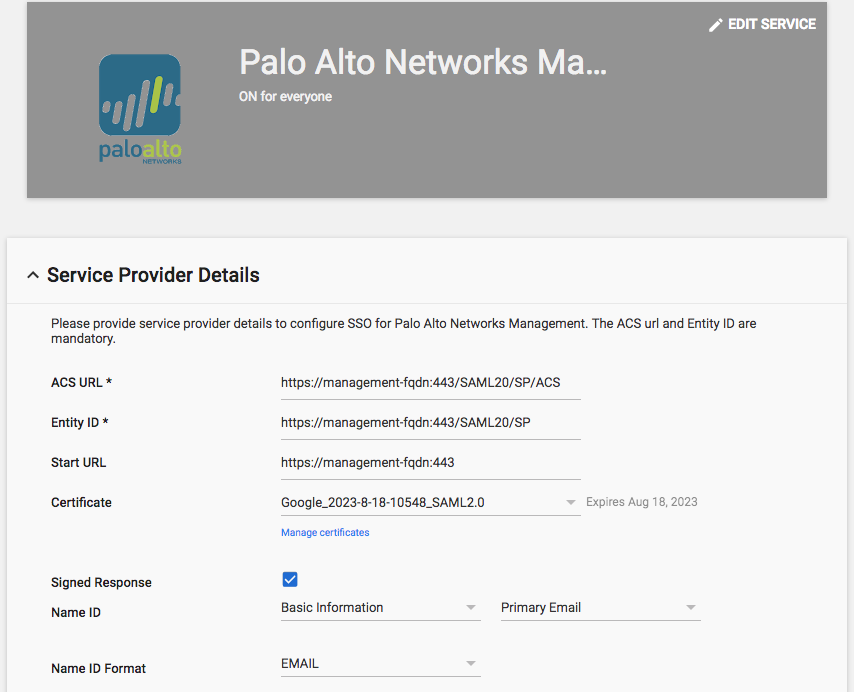 - Google does not require signed requests. Palo Alto does require signed responses.