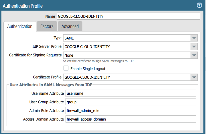 - Update: the Palo Alto Networks Firewall can now take advantage of additional options returned here (such as Group, first and/or last name, user role). As a result, mapping additional Google Cloud Identity attributes allows you to pass information from your Google domain back to the device. This can be useful for grabbing group information and/or device admin privileges straight from user attributes stored in Google. We can map these attributes later on when we create our authentication profile.